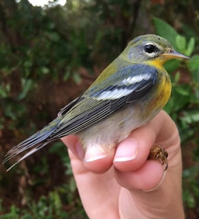 We had a great diversity of birds today that we got to share with the visiting Charleston County Master Naturalist class. They were able to come out for a couple hours this morning to observe and learn about the banding process. It's always fun educating the public about the importance of long-term banding projects and they were excited to see birds up close in the hand. This morning we caught a total of 40 new birds and 12 recaptures of 15 species. Though not our first of the season, I was thrilled to get to band my first Northern Parula! Northern Parulas often forage high in the canopy, but will come lower during migration. There is an interesting gap in their northern breeding range possibly due to habitat loss and air pollution, which affects the growth of moss on trees that they depend on for nesting (Cornell Lab of Ornithology All About Birds). Another cool catch today was a recaptured Gray Catbird previously banded by Aaron on October 12, 2016.