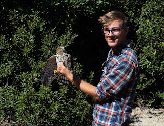 Today was an oddly slow day at the station. We were expecting it to be at least a little busier than yesterday. Thankfully it’s autumn now and the weather is pleasant enough to sit around outside. We were able to do some net repair while we were out there and enjoy some of the other facets of the natural world, like the Monarchs! Our main excitement for the day came from the return of a Coopers Hawk. Early in the morning he ended up in one of the nets and got out, leaving behind his rodent breakfast sitting in the net. I took the deceased rodent out of the net and put it below hoping that the silly Cooper’s Hawk would be silly enough to try and go get it. I was right except he did it without ending up in the net. I was quite surprised when I went to check the net to find the rodent missing and no Cooper’s Hawk. However, much later in the morning, Josh and I were coming back from a net run via a shortcut we’ve got and came up on that same net. In that net was finally our Cooper’s Hawk! A very nice hatch year male! A first for me in the hand since I’ve been a bander! Afterwards we processed our other birds and went to close up the nets for the day. I had already written a haiku about Monarchs today or I would’ve made one about our Cooper’s Hawk!