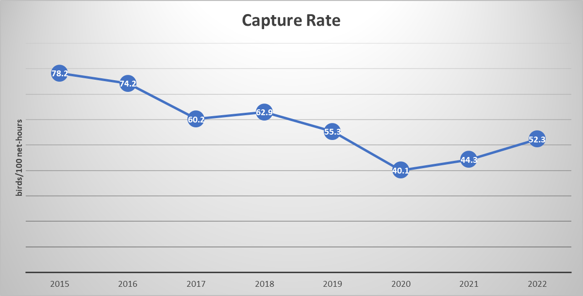 net-hours lower than the 10-year average of 49.5 birds/100 net-hours. Our capture rate has decreased every year