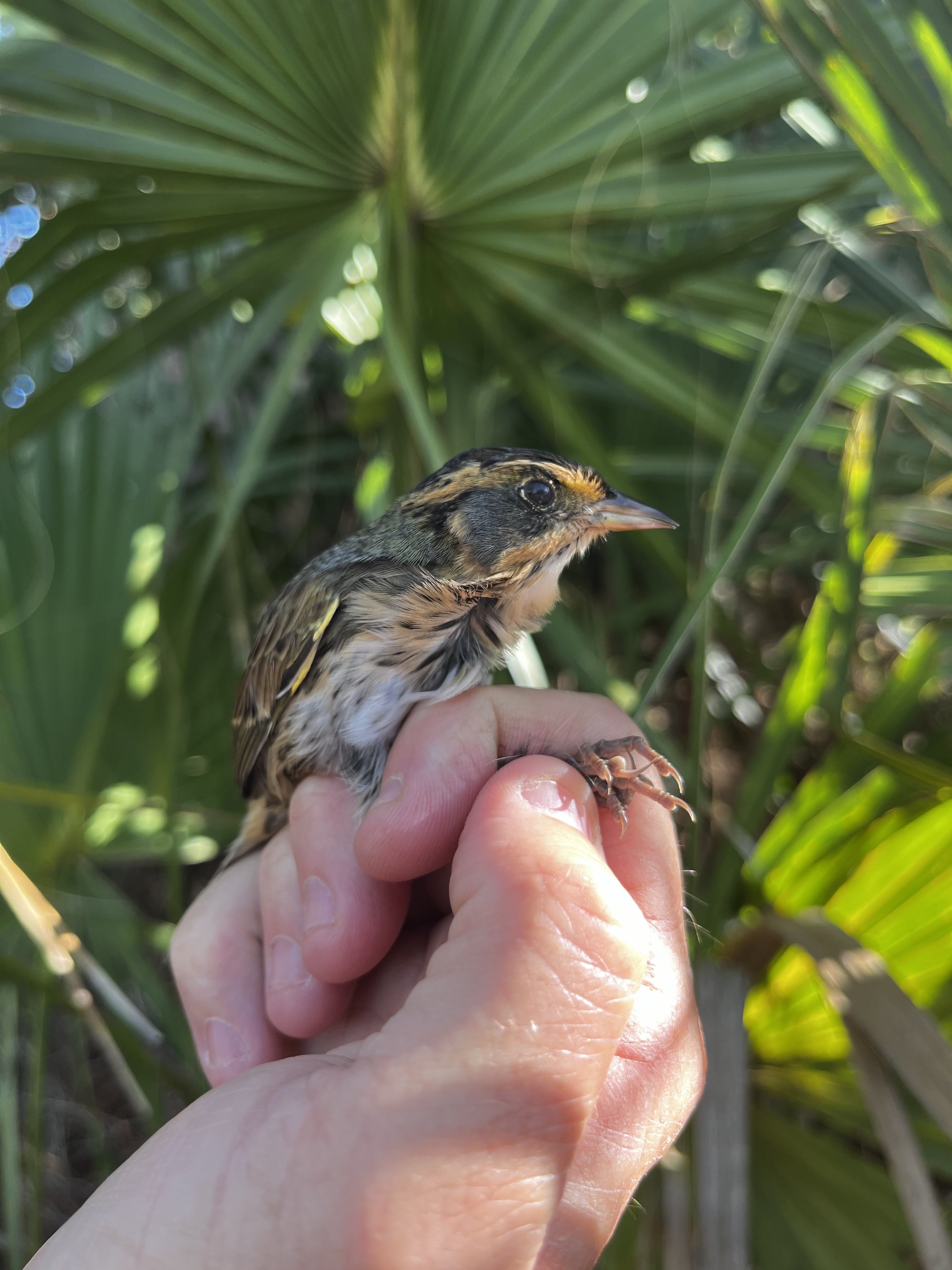 Fog greeted us this morning as we shook out the moisture from the nets. Being a little cooler today, we got a little pulse of Myrtle Warblers with a total of 19 new individuals, and various other warbler species. There was a total of 38 birds and 11 species, including 1 new for the season. We caught a Yellow-shafted Flicker, who had a molt limit within the greater coverts, characteristic of a Hatch-year bird. In addition, we caught a recaptured Pine Warblers, which is rare for this time of year. We spent our time fixing some more nets today to prepare for the busy days to come.